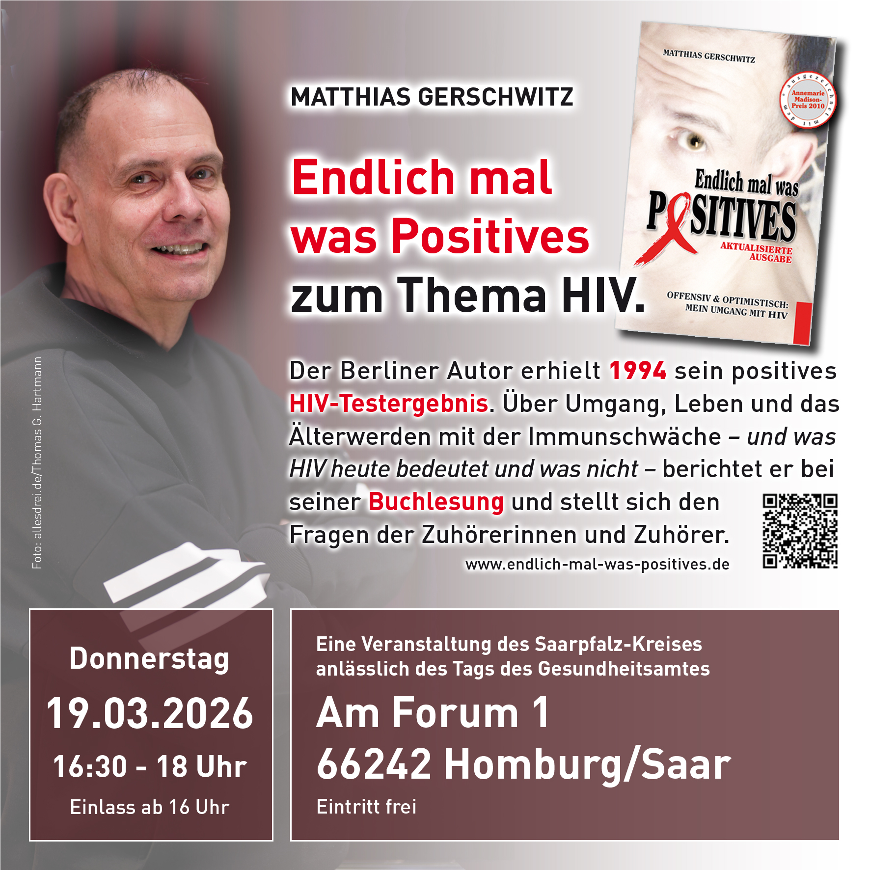 Es gibt nur wenig Bücher in Deutschland, in denen HIV-positive Menschen aus ihrem Leben mit der Infektion berichten. »Endlich mal was Positives« erschien in der ersten Fassung Ende 2009 (Überarbeitung und Aktualisierung 2018) und stieß schnell auf positive Resonanz. Denn die besten Informationen zu einem Thema erhält man immer noch aus erster Hand. Seit 2010 habe ich auf Einladung von Aidshilfen und Gesundheitsämtern, aber gelegentlich auch auf private Initiative, z. B. von Lehrer*innen oder Eltern, eine große Zahl von Lesungen gehalten, u. a. in Buchläden und Stadtbüchereien bzw. -bibliotheken, aber auch an der Ludwig-Maximilians-Universität in München, im Universitätsklinikum des Saarlandes in Homburg, der bASIS in Frankfurt am Main, der Weissenburg in Stuttgart, der Akademie Waldschlösschen bei Göttingen, dem Literaturhaus in Salzburg, dem Unterhaus in Mainz, beim Schwulen Sommercamp des DGB Südwest in Markelfingen am Bodensee und an vielen spannenden und schönen Orten mehr.